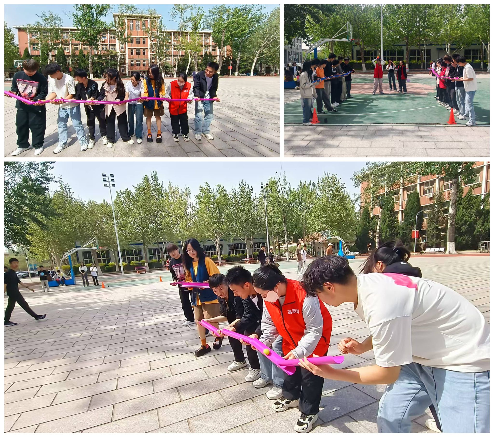 纽中,各组队员用路线交力传送小球,磨练理解取耐烦;“二人3脚”角逐中同砚们拆肩挽脚、步调团结,正在欢乐中融会信赖取协同的实谛。到场的同砚高慢天道:“尔们没有是最速的,但必定是协同最棒的!”。