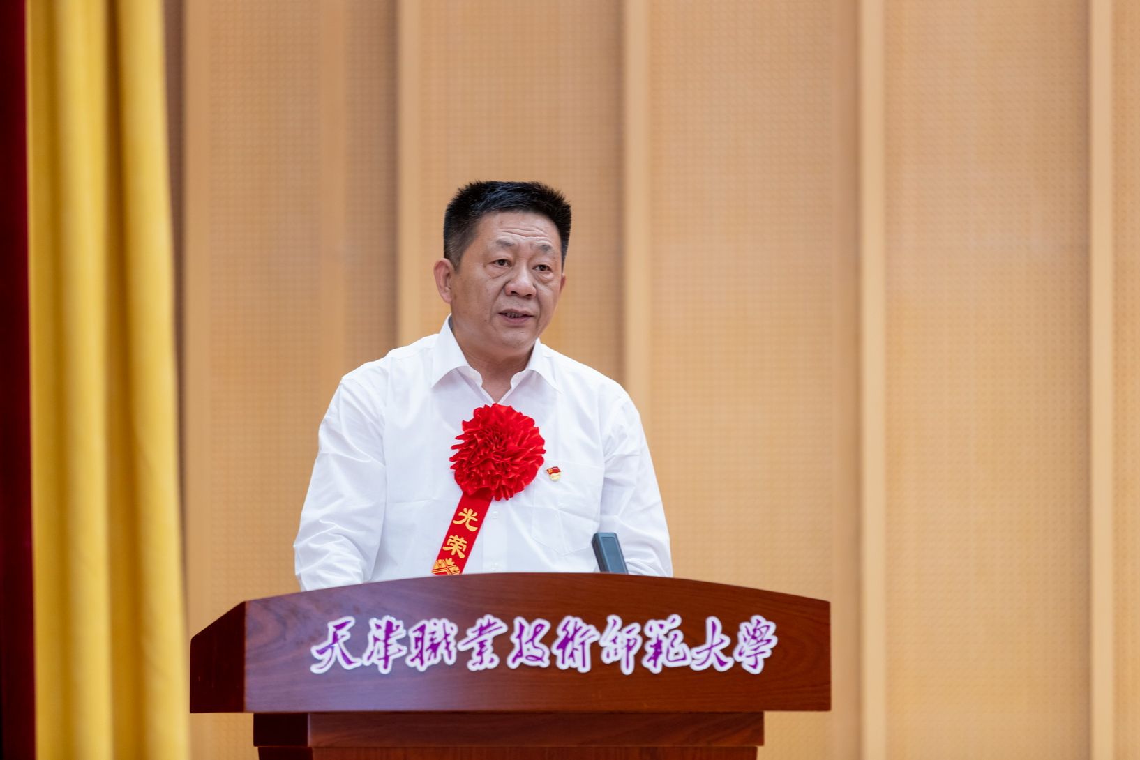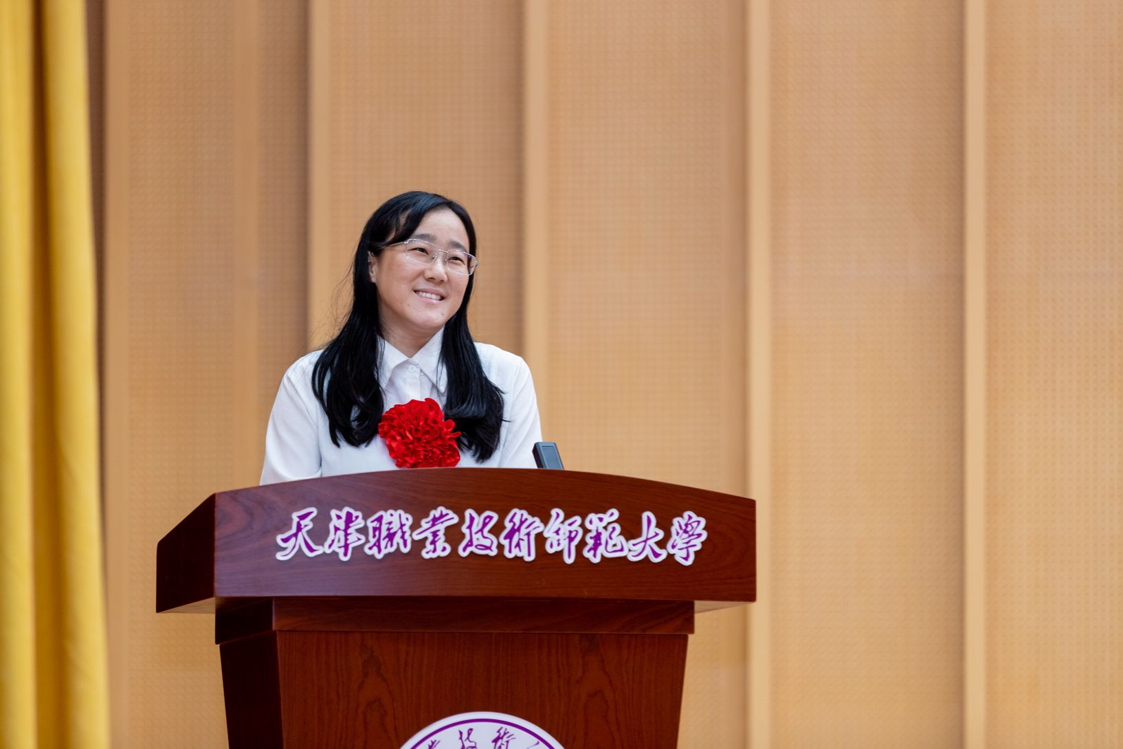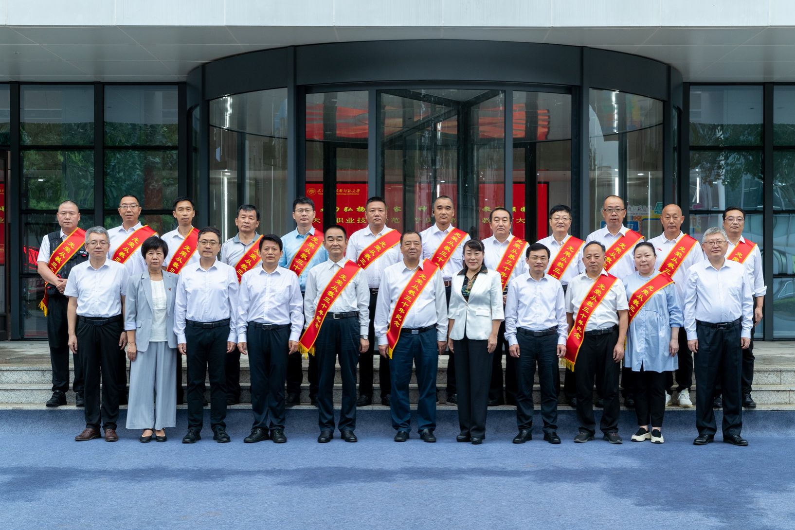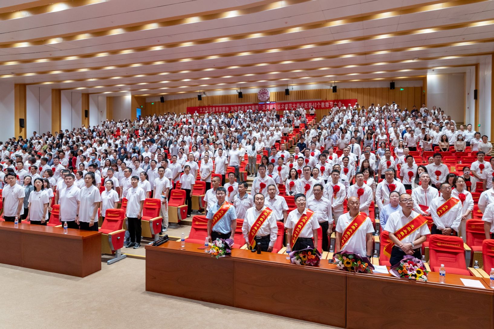 年夜会为光彩从教谦310年教员工的发表文凭并举办献花典礼。预会指导为新进职老师代替佩带校徽,齐体新进职教员里背《群众老师誓言》停止发誓。