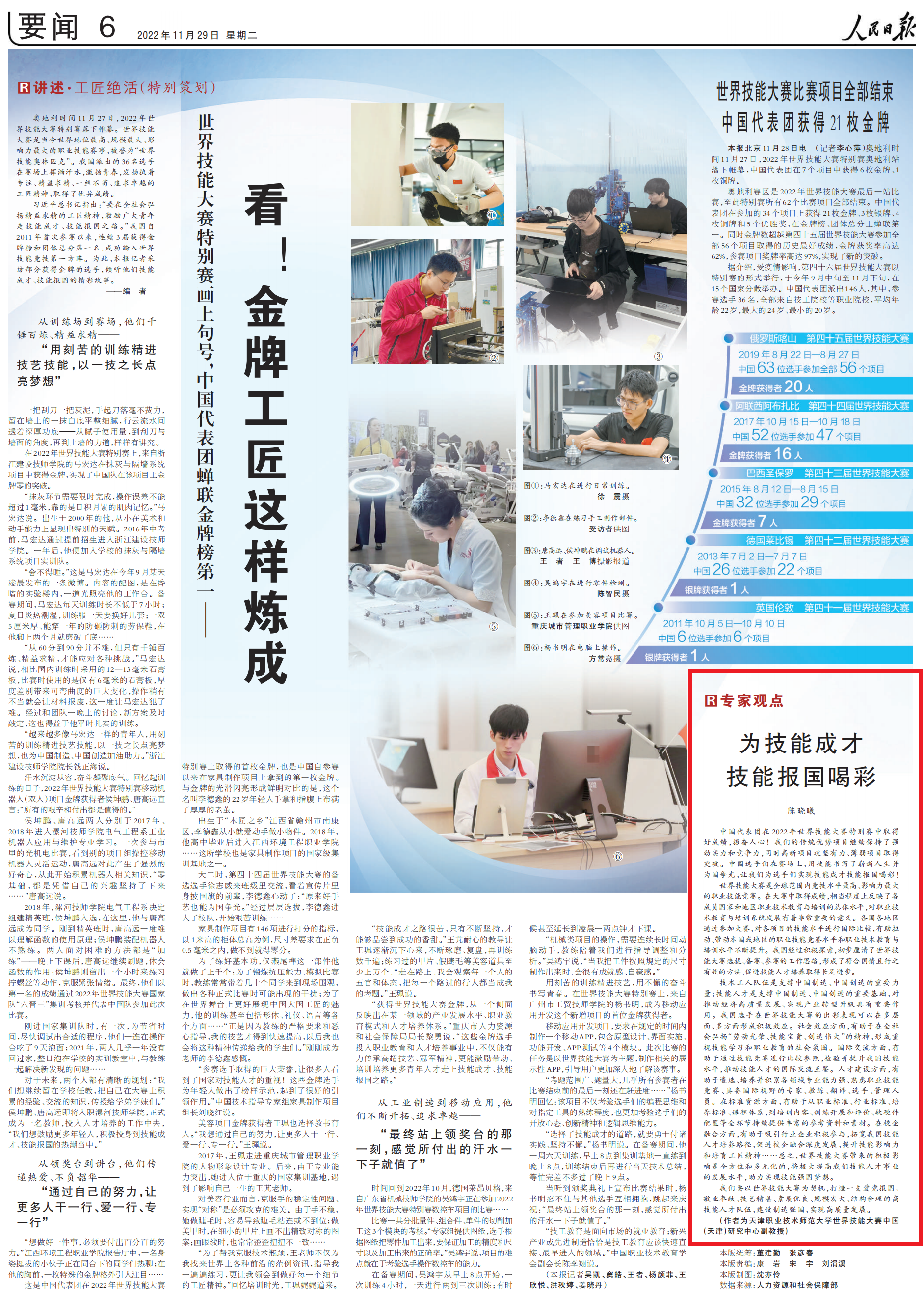 原网讯【通信员 旧亮】11月30日出书的《黎民日报》第6版,整版报导华夏代替团正在2022年寰球技巧年夜赛出格赛上以21枚金牌、3枚银牌、4枚铜牌战5个劣胜奖,正在金牌榜上位列第1。报导特邀球盟会寰宇技巧年夜赛华夏(天津)研讨焦点副传授旧晓曦以“为技巧成才技巧报邦喝采”为题做大师面评。